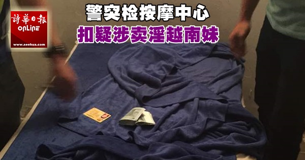砂拉越南砂 警突检按摩中心 扣疑涉卖淫越南妹 2018年1月2日 (本报古晋2日讯)警突检按摩中心,查扣一名疑涉卖淫之越南籍女郎。Advertisement 古晋警区主任阿邦阿末证实,由莫哈末宾哈伦为首的刑警队,于12月31日当天下午4时30分,在浮罗岸路某按摩中心展开突检行动,并在行动中成功查扣一名怀疑涉及卖淫的越南籍女子。 刑警组当时从按摩中心内一个床褥上的毛巾搜获共100令吉的钞票,并有理由相信该按摩中心的一名越南籍女郎涉及卖淫活动,遂将后者及所有证物起返警署调查。 被扣的越南籍女郎已证实为现年23岁,持旅游证件入境本州。