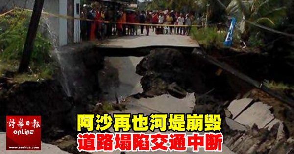 砂拉越南砂 阿沙再也河堤崩毁 道路塌陷交通中断 2018年1月5日 (本报古晋5日讯)雨水及大涨潮所致,阿沙再也甘榜端必腊肇河堤崩毁,道路塌陷交通中断!Advertisement 目前坍塌事故虽无波及住家或造成伤亡,但居民忧心下一个涨潮及大雨会导致情况恶化。 上述事故是今日中午12时左右发生,上述甘榜今早下大雨,而且适逢大涨潮,导致河水高涨,结果河岸崩毁,情况逐渐加剧并延伸到村中马路。 在地下泥土大量流失的情况下,马路终于塌毁,导致村路中断。