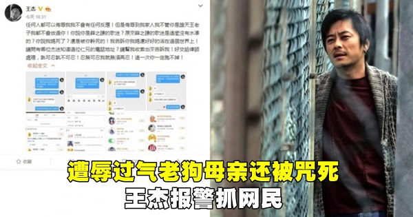 隨后王杰回呛「我妈还没死,你等著吧!」扬言一定会处理这桩辱骂风波,没想到该名网友还囂张表示「好怕,你婊子妈很快就死了,被我干死的!」用词相当难听,让王杰相当不满,强调「等这两天工作完,报警处理。」扬言一定要揪出这位白目网友。稍早则清空微博,只留下一篇「我对的(得)起我自己」文章,感嘆:「人永远只会看到別人犯的错,却看不见自己的!」