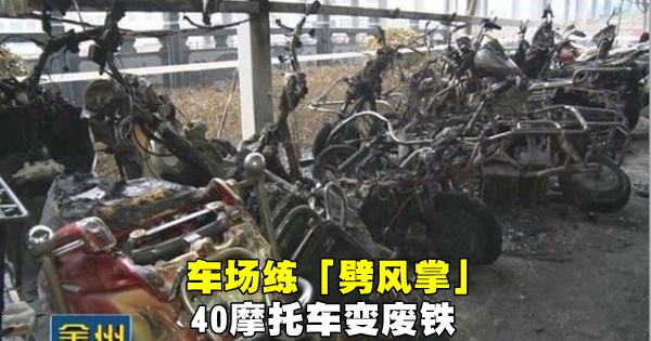 中国陕西安康汉阴县一名男孩,上周三在公共停车场用蜡烛练习「劈风掌」,结果离开时没有扑灭火苗,造成40多辆摩托车、电动车被烧成废铁。