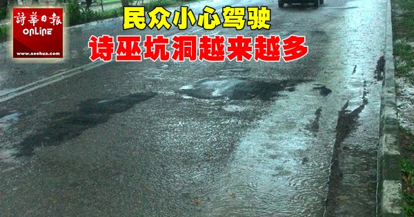 砂拉越中砂 民众小心驾驶 诗巫坑洞越来越多 2018年1月19日 Jpeg (本报诗巫19日讯)公众投诉最近雨季里,市周围以及住宅区的道路出现越来越多的坑洞,令开车的顿感不便,因为一不小心的话,随时都会撞坏轮胎。Advertisement 一名读者向本报投诉,现在的住宅区,或是市中心,几乎是各角落都有坑洞,尤其是不断下雨后的近期内,可以发现路面的窟窿已越来越多。 他希望当局能派员巡视并加以修补,以策交通使用者的安全。