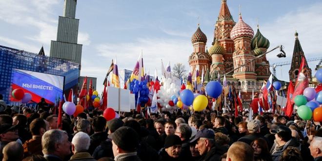週三在红场附近举办的「我们同在一起」游行音乐会。莫斯科市民手持国旗、標语和白蓝红三色汽球前来参加。根据官方统计,现场至少聚集了11万名民眾,场面相当盛大。