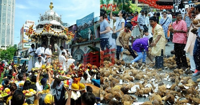 游行路途两旁聚集上万名善信,向姆鲁甘战神献祭祈福,善信也在沿途拋掷椰子,意味著去除霉运,净化自己的內心。