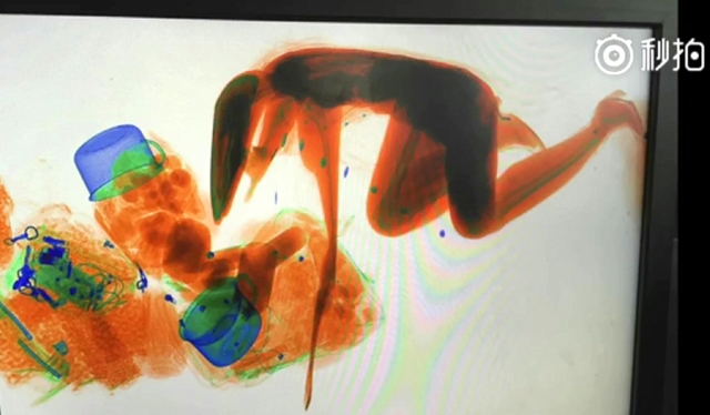 傻眼!中国一名女子前天到广东东莞市要搭车,因为担心随身包包内的财物遗失,竟然连人带包进入安检机,结果显示器就出现人形透视图,骨骼被照得一清二楚,令安检人员傻眼。