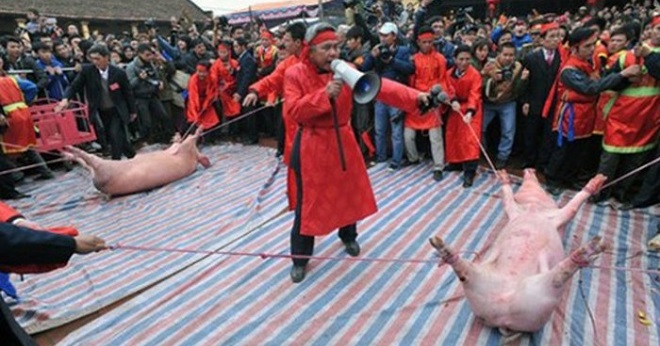 北寧省南上村的每逢农历新年初六,民眾举行杀猪献祭仪式,先把一只肥猪游街,隨后綑绑起来,当眾剖猪肚和砍猪头。这项习俗延续约800年,相传13世纪一位將军在当地开拓,杀野猪让士兵吃饱,日后村民每年杀猪祭神,祈求来年风调雨顺。