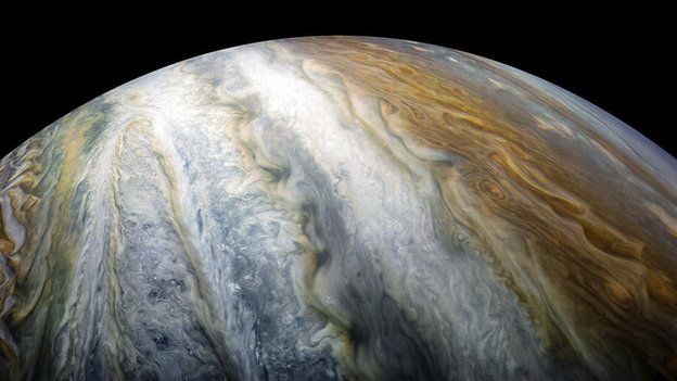 数据显示,木星表面迷幻的漩涡云带和喷射气流在强风吹袭下,以不同速度朝反方向移动。