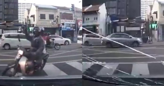 (檳城13日讯)一名驾著摩哆的男骑士日前不知何故以石头砸破一辆优步(Uber)轿车的车镜,警方尚在追查事件起因。