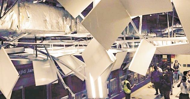 (吉隆坡23日讯)占美清真寺轻快铁站天花板週一下午突然倒塌,所幸事发当时没有乘客经过,无人受伤!