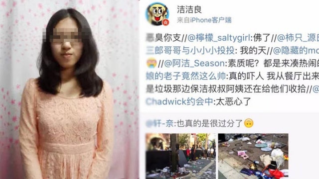 中国多家媒体报导,网名「洁洁良」的女生发文痛骂「恶臭你支」乱丢垃圾,让清洁人员辛苦清理。贴文遭批评后,她再次发文:「为甚么傻X国人干出来的傻X事不敢承认,开除得一手好国籍,国家支意盎然正是低智粉红和恶臭国人的缘故」、「粉红豚的低智到我无语…又怂又蠢,语言都表达不清楚,支之所以为支他们有很大功劳。」。