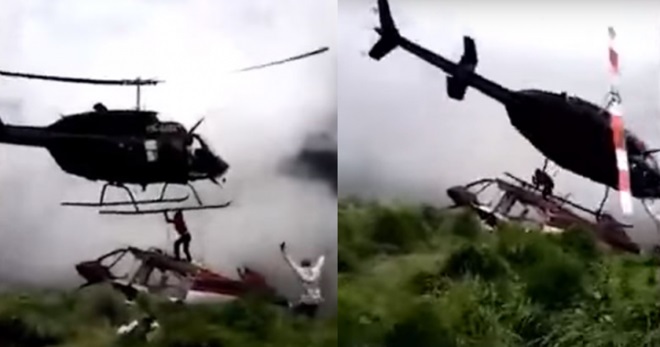 《每日邮报》报导,一架直升机坠毁在考卡山区并有2人受困,而另一架救援直升机抵达后缓缓下降,留在地面上的2名人员则挥手向机师示意。
