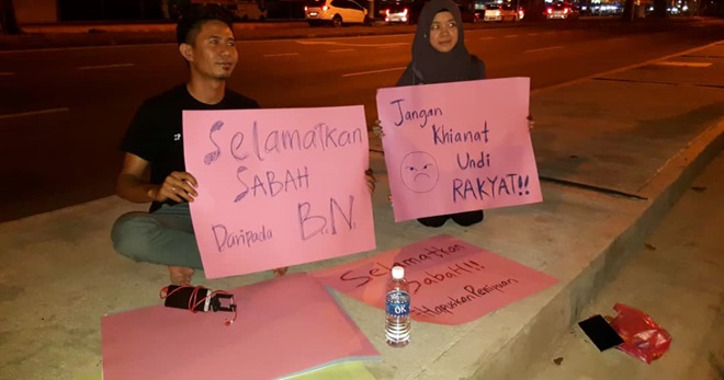 沙巴 不满国阵与立新党联组新政权 青年举大字报抗议 2018年5月10日 斗湖10日讯|青年不满国阵与立新党联组沙巴州新政权,召集在斗湖市议会前举大字报,抗议。Advertisement 大字报内容有:从国阵处拯救沙巴。莫污辱人民的选票。拯救沙巴,防止欺诈。