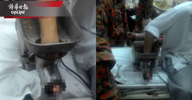 砂拉越北砂 右手卷入机器 青年4手指惨遭绞断 2018年5月15日 青年右手卷入机器里;消防员想尽办法拆开机器。 (本报美里15日讯)青年绞肉时右手卷入机器,4只手指被绞断卡住,动弹不得,酒店负责人向消防与拯救局求救。Advertisement 昨晚10时本市某家酒店餐厅厨房发生一宗罕见意外,一名青年负责绞肉时,右手不慎卷入机器中,其同事听见青年惨叫声,连忙切断电源,并向消防人员求助。 消防人员到场,检查青年卡在机器中的手指后,花费了将近一个小时,才成功把青年右手脱离,惟其4只手指已被绞断血肉模糊,随后马上将他送进医院就医。 据说,青年右手4只手指已无法驳回。