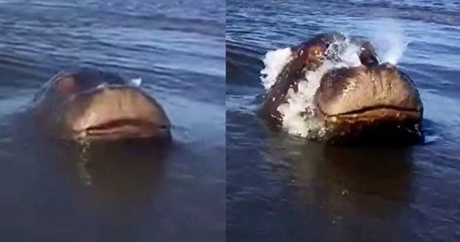 接下来,只十几秒的功夫,这只庞然大物居然突然冒出水面现身快艇旁,天呀,是只大河马!巨大的脑袋差点撞上快艇,太险了!