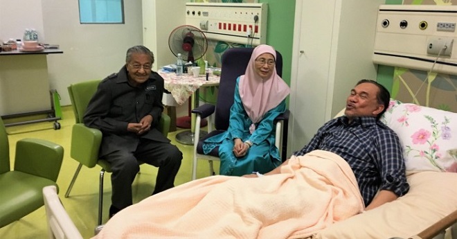 安华晚间在推特转载一张照片,可见敦马到马大医药中心探望他,一旁的还有其夫人副首相拿督斯里旺阿兹莎。