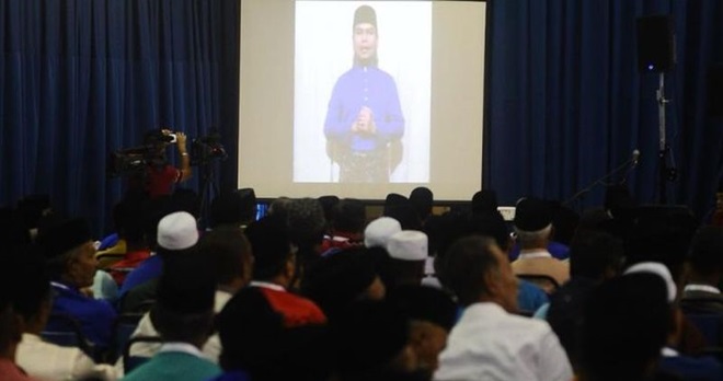 据《每日新闻》报导,以一袭蓝色马来传统服装亮相的嘉玛,透过视频,现身巫统大港区部会议礼堂上的银幕。