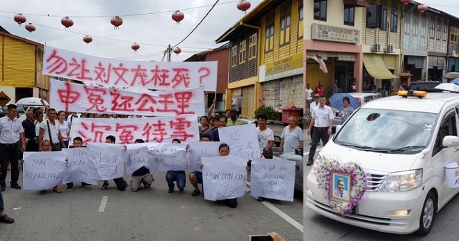 (美冷6日讯)疑遭警方围殴而引发心臟病身亡的美冷车站新村平民华小家协主席刘文龙今日举殯,前来送殯的亲友纷纷拉起横幅及大字报抗议,盼为死者討回公道!