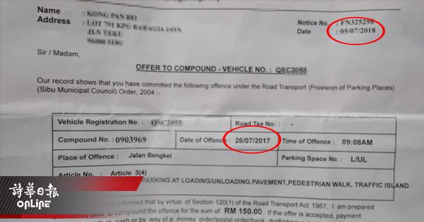 根据这名车主表示,他日前接到诗巫市议会的罚单,指他一年前(2017年7月26日)在机械路违规泊车,因而对他开出一张150令吉罚单。然而,林这名车主不满的是,为何当局相隔了将近一年才发出罚单,而不是当天收到。