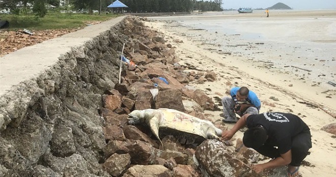 上个月一只绿海龟在尖竹汶府搁浅,被发现时已奄奄一息,最终死亡。兽医在牠体內发现大量塑胶及橡皮筋。