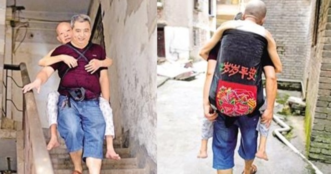 「父母在,不远游。」来自重庆市忠县54岁的唐大权,天天都背着80岁的老岳父爬上5楼,黑色束带上印着斗大的「岁岁平安」,是他把儿子的背带拿出来改良的,这一年来背上楼又背下楼,一声苦也不喊,获得「中国好女婿」的美称。他感叹,当父母年纪老了,生活无法自理时,也应该像婴儿一样被温柔对待。