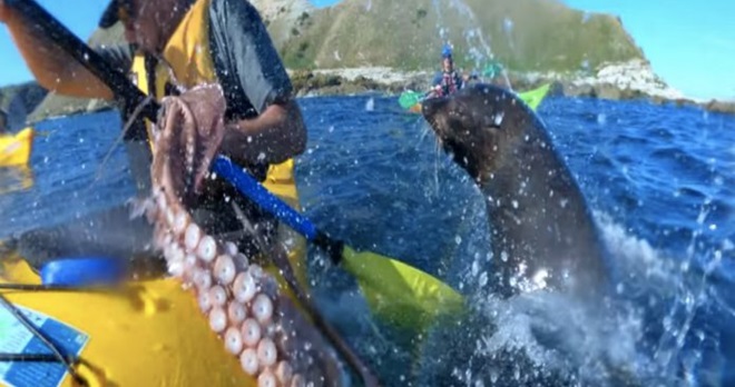 影片中,一行人激动、兴奋地划船出发,大约中午时分,他们发现海底下有海豹正在觅食,为了一窥自然生态,他们深入海豹的觅食区观赏,接着有一团谜样巨大生物逼近穆林德的独木舟,正当友人好奇那是什么生物时,海面飞出一只大章鱼直接「打脸」友人,同行朋友纷纷笑翻。