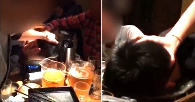 影片中,伴随男男女女喊话倒数,男员工被人用手抓着头栽进煮得滚烫的火锅,同时还有人在涮肉片,一次还不够,男员工随即又被压进火锅,而且用力到锅子从火炉上滑下来,在场的人又是尖叫又是狂笑。