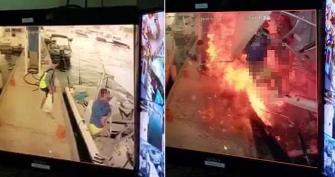 监视器画面更可见,当时一名刚好坐在船中的男子,整个人被爆照的巨大气流抛上空中,更被大火纹身,最后更被游艇碎片压住全身,另外一名站在码头上的加油员,也差一点坠海。