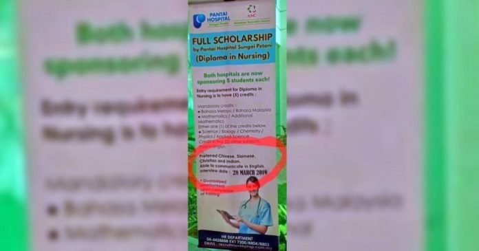 (双溪大年19日讯)私人专科医院提供全免护士护理课程专业文凭奖学金的横幅上,表明「较喜欢」(preferred)接受华裔、印裔、泰裔及基督徒申请者的字眼,而漏了巫裔,引起巫裔网民的热议。