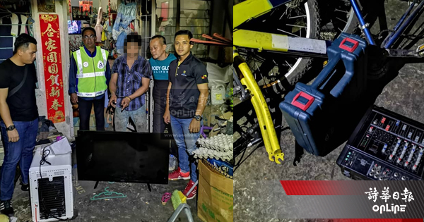 警员抵达现场时,先将有关住家重重包围,在四周埋伏该名男嫌犯,随后进入屋内成功将他逮捕,并吩咐他把所偷窃的财物全交出来,当中包括了电视机、脚踏车、工具箱和水机等等。