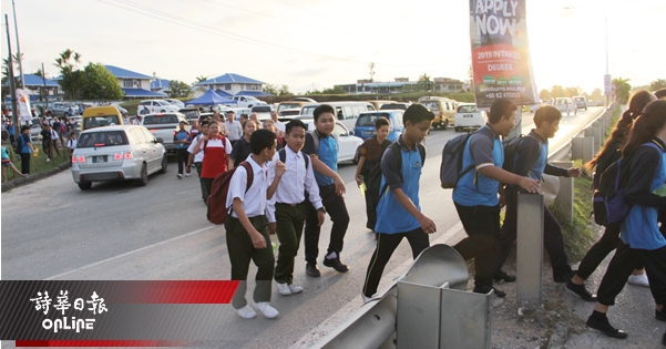 砂拉越民都魯 市镇国中还没行人天桥 学生过路很危险 2019年3月14日 (民都鲁14日讯)市镇国中行人天桥建设方案久未落实,人联党民都鲁支部再三催促,吁当局正视。Advertisement 该支部一行人,昨天傍晚在主席潘隆铭的带领下,前往市镇国中路段,视察学生过路情况,以收集翔实资料,向当局反映。 现场所见,许多家长为方便,让孩子在道路另一端下车,自行过路到对面学校上课。 奈何,由于繁忙大道车来车往,以致学生穿越道路,险象环生。 出席者包括主席潘隆铭、署理主席甲必丹姚本忠、青年团团长沈象洪、组织秘书曹长发、理事包宜盛等人。