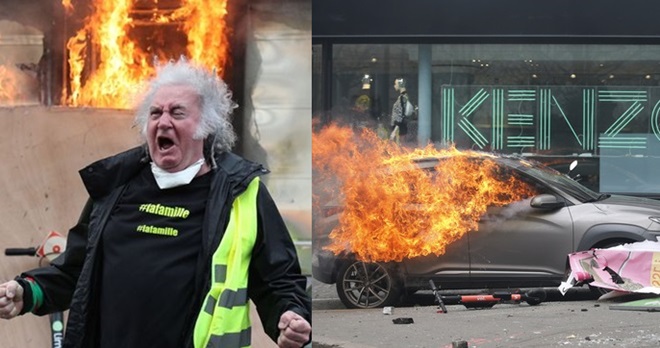 法新社报导,示威者在巴黎街头与员警爆发冲突,有人向镇暴警察投掷烟雾弹、石块及其他物品,有人则到处纵火、破坏店铺橱窗。过程中,一间专门接待政商名流的餐厅(Fouquet’s)及一间银行先后被放火。消防队救出住在银行楼上的一对母子,而这起火灾造成11人受伤,包括2名消防队员。
