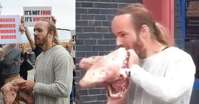 从现场拍摄的影片中看到,当时动物权益组织「The Direct Action Everywhere」(DxE)成员高举「这不是食物,这是暴力」及「吃肉是谋杀」的标语,一名男子拿着一个生猪头走近他们,然后将猪头直接放入口中啮咬。