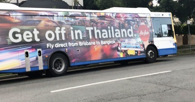 原来在年初,泰国亚洲航空在全世界各地开展战略促销,在澳洲城市布里斯本的公交车上投放了印有“Get off in Thailand”的广告,这句广告语字面意思为“在泰国着陆”,实则也有“在泰国达到高潮”的色情引申寓意,如同邀约外国游客到泰国进行性行为般尴尬。