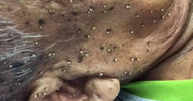 由照片可见,这位阿公的脸上,被插入了密密麻麻的蜂针,而白白的针头则露在外面,医师处理拔除下来,黑麻麻的一片也非常吓人。