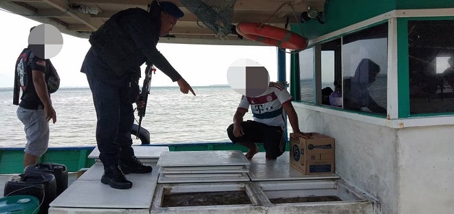 山打根10日讯|三艘渔船因涉嫌在禁区内拖网捕虾作业,遭山打根水警行动部队取缔拘捕,重达150公斤,市值约1875令吉的渔获被充公。