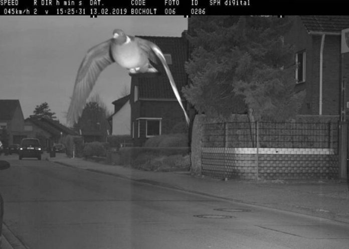 超速飞行?德国博霍尔特市(Bocholt)警方日前公开一张测速照相机拍摄的相片,不过,被拍下的对象并非任何汽车,而是一只高速飞过的鸽子。