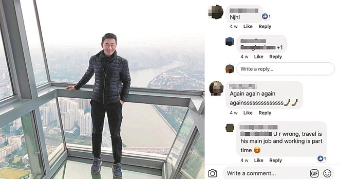 通常他在外国旅行上传打卡照时,必定会出现“njhl”或“again?”(又去?)的留言,甚至有朋友会留言亏他“旅行就是他的工作”。