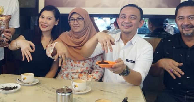 他今日是偕同夫人哈米达医生和一众教育部官员趁官方考察之便,下午时段来到麻坡二南大象豆咖啡馆,享用他最喜欢的麻坡“434”咖啡。