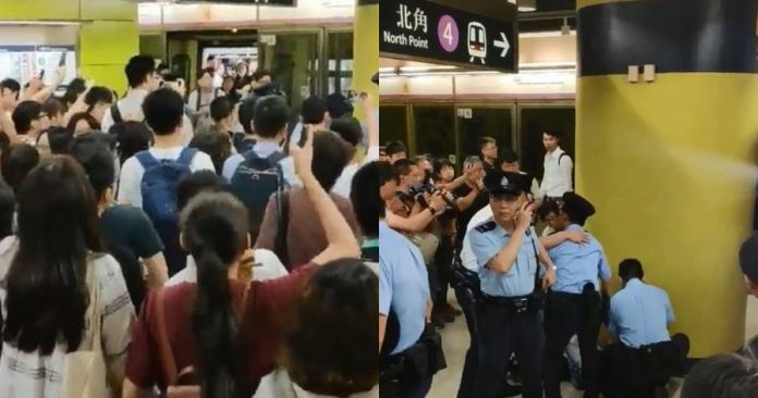 据《东网》报导,今早8时,港铁调景岭站月台突然聚集约30人,当中一名男子突然跌倒受伤,在场的大批警员即时上前了解,将他带走。在场人士起哄,大叫“放人”。该名男子报称不适,稍后由救护车送院治理。