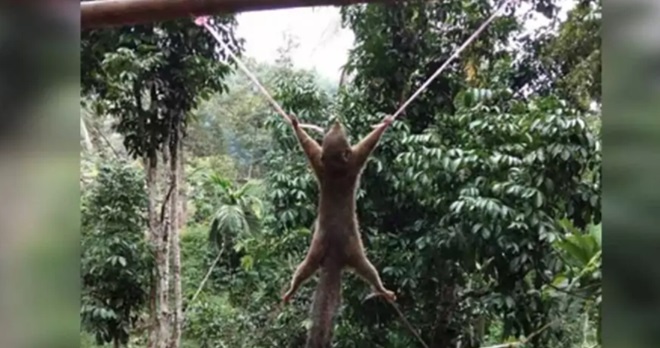 泰国一名男子日前在脸书发布一张悬空绑住松鼠四肢的照片,表示这是对松鼠偷吃榴莲的惩罚。