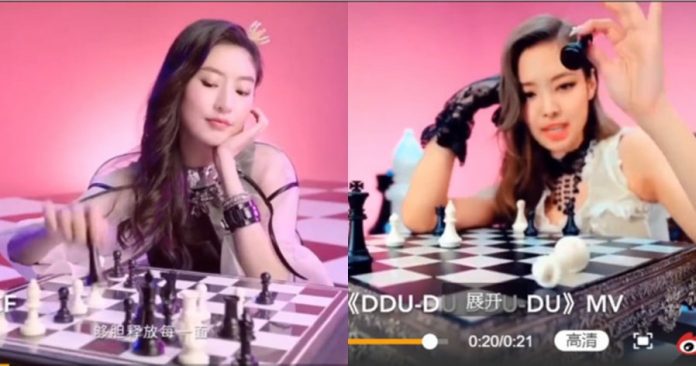 据台湾《ETtoday》报导,中国网民点名某知名速食店新推出的广告疑似抄袭,广告中背景板是粉红色的,头上别著小皇冠的女演员坐在黑色皇冠椅子上,地板黑白格子相间,女演员前方摆著棋盘。对比BP的MV,相似的粉红色背板,Jennie头戴皇冠坐在高处椅子上,下方一样是黑白色棋盘状地板,一样也有推倒棋子的画面。