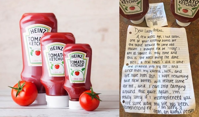 餐厅老板事后将字条的内容公开在面子书,纸条内写道,“几个礼拜前,我偷了你们一瓶番茄酱,没想到之后就有人撞上我的车,而且我的事业、运气和生活也开始变得一团糟。我希望归还2瓶全新番茄酱可以让我的生活恢复正常,并且得到原谅,不再有罪恶感。”