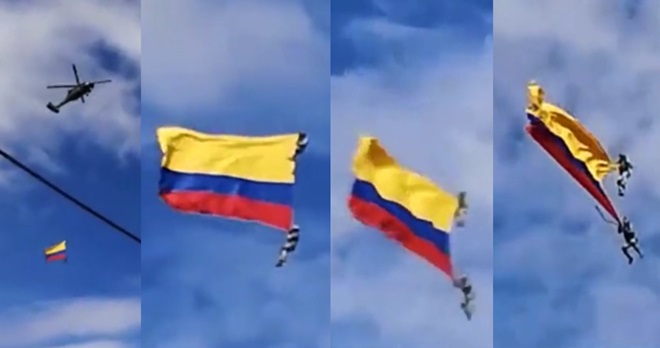 据英国《每日邮报》报导,当时空军呈现的表演,使用两架直升机各悬吊一面哥国国旗,国旗上的上方与底部,各有一名士兵撑旗,士兵在表演过程中还会和现场观众挥手。