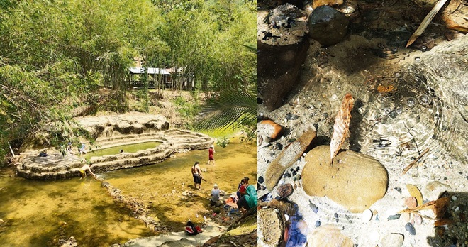 首先抵达入目是右边的歇息亭和更衣间,有提供淋浴、厕所和纯更衣处。略微往前左侧是烧烤炊火点,这个比较简陋,没有任何桌椅,你得自备地垫进行烧烤活动。往下走便是今天的重头戏——温泉。映入眼帘的小河湍湍在眼下,这种俯视感首先是美景尽收眼底,先抚平刚才一路走来的燥热,再慢慢踩入水中感受凉意。河水冰凉,中间隆起被围起来的区块是热泉处﹐一般上大家多是先在冷水中浸浸身再换热泉泡。