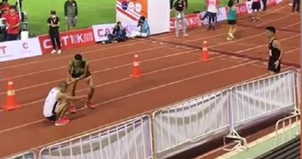 这时有一名穿着绿色衣服的跑者,也准备冲过终点线,但就在跑过距离终点5公尺之处,看到了这名受伤的跑者。这名绿衣选手完全没有犹豫,放弃直冲终点线,他马上折返救援。