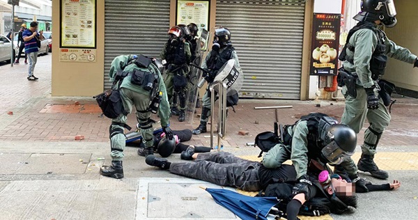 影像可见,有大约10多名穿着黑衣的示威者手持各式武器追打一名员警,其他员警见状便赶紧前来压制,之后就传出一声枪响,导致18岁的中五学生曾志健(音译)倒地溅血。