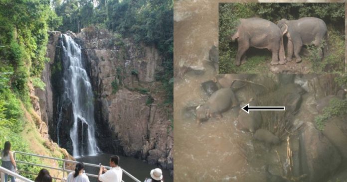 据泰国媒体报导,当地考艾(Khao Yai)国家公园近日接获通报,表示一群大象在瀑布附近挡住道路,不时发出叫声,救援队抵达现场后,发现一头年仅3岁左右的幼象已在瀑布第一层溺毙,岸边有2头大象正筋疲力竭地想要拯救孩子。