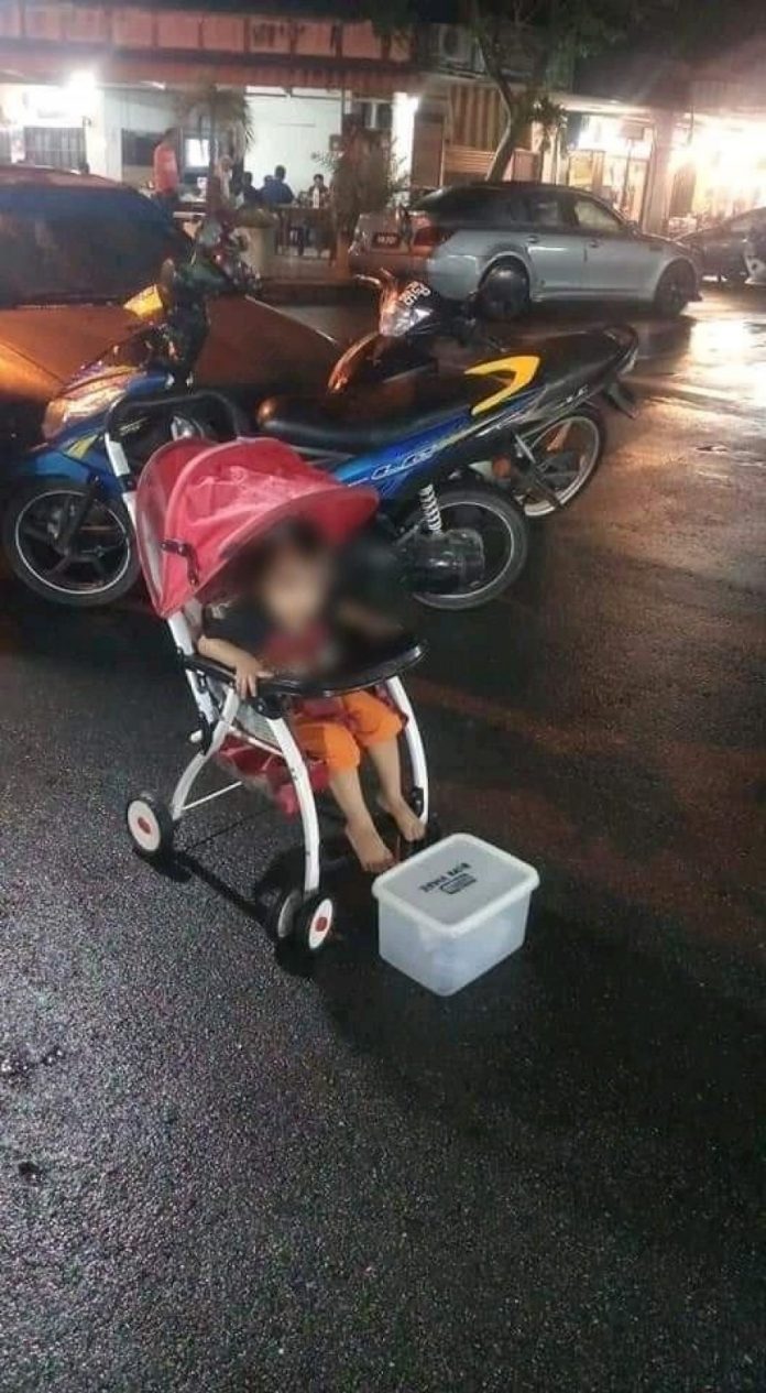 这起事件于昨晚在社交媒体遭网民揭发,根据网传的照片显示,一名年幼孩童坐在婴儿车里,被推到湿漉漉的马路旁,脚下放著一个捐款箱。