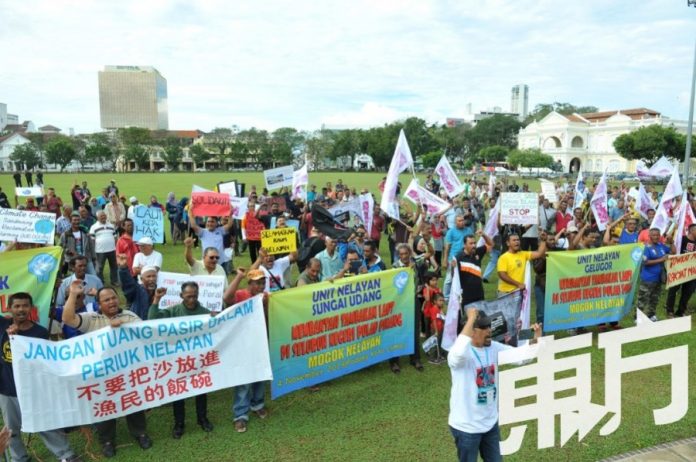 (槟城4日讯)由槟州各区的渔民及非政府组织发起的渔民团结之日,获得逾百名渔民及民众参与,通过水路及陆地,兵分两路前往旧关仔角向槟州政府反映终止槟岛南部填海计划(PSR)的意愿。
