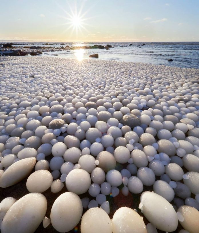 其实这些“异形蛋”只是冰冷海水结合沙石自然形成的冰球。据芬兰气象研究所的专家解释,冰球是罕见的自然现象,只要接近结冰状态的海水冲上较浅的沙质海岸,海水附在沙石上结冰。经过多次海浪冲刷后,冰层愈来愈厚,冰球奇景便会出现。