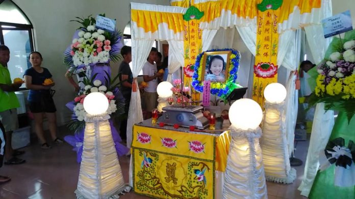 黄家男女双方的亲友今早在日落洞殡仪馆完成最后一场丧礼。小死者黄惠煾的丧礼以佛教仪式进行。亲友们于早上8时40分把多朵手折的往生纸莲花,放入小死者的灵柩内。